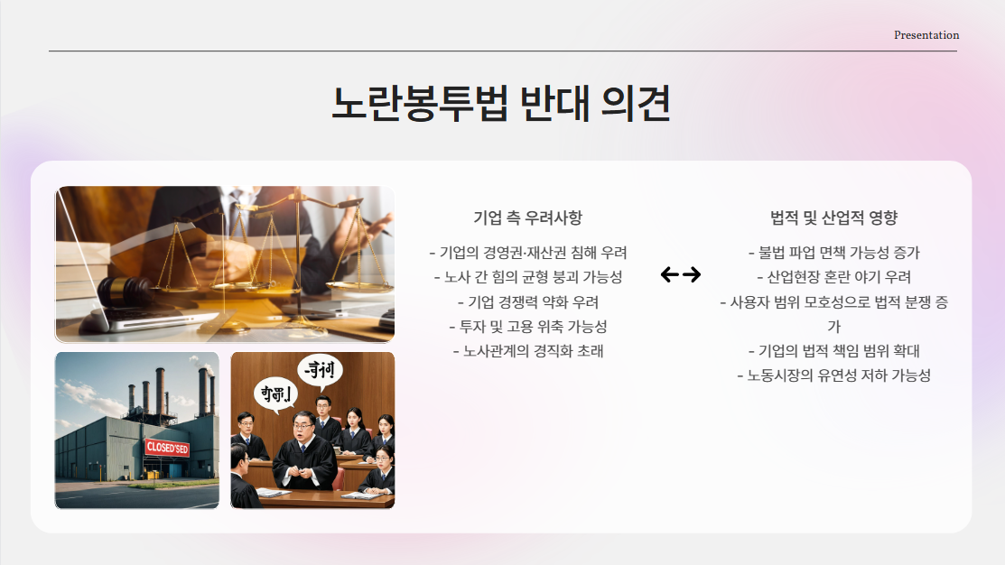 정당한 파업에 대해 기업이 막대한 손해배상 청구를 하는 현실을 바꾸고자 만들어진 법안입니다.